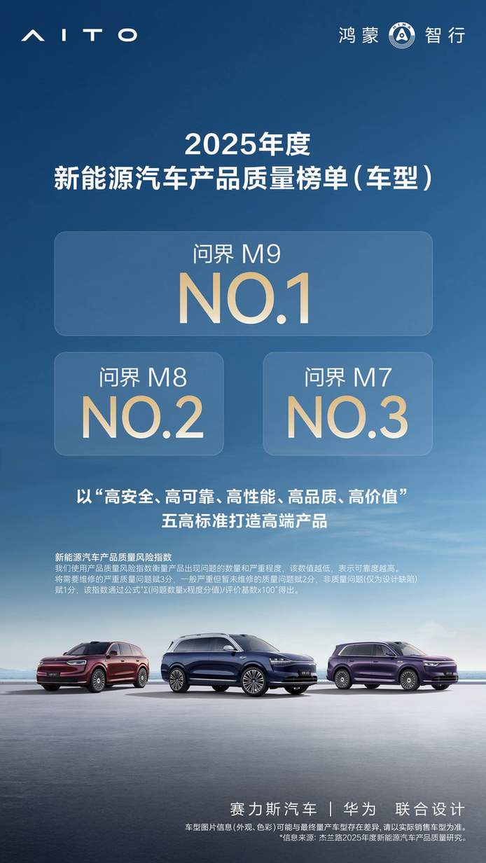 根据杰兰路最新发布的《2025年度新能源汽车产品质量研究》显示,在中大型及以上SUV市场中,新能源汽车产品质量排名第一的车型为问界M9,整体质量稳定性表现突出。