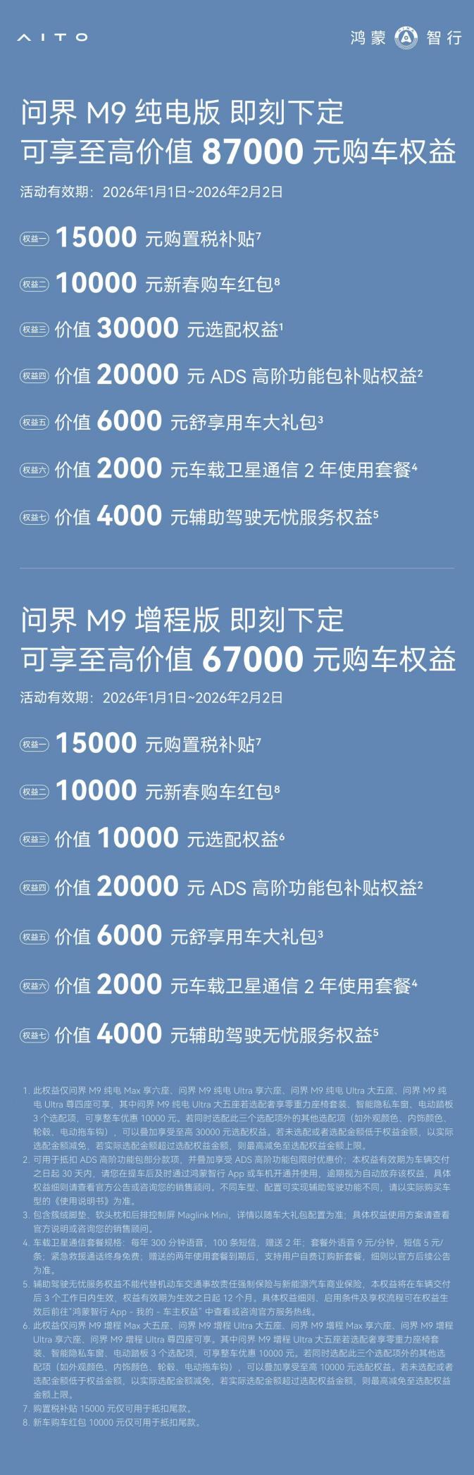 值此新春来临之际,问界M9特别推出多重购车礼遇,至高价值达87000元。新春新程,问界M9将继续秉承智慧重塑豪华理念,不断开创新能源汽车的全新境界,持续引领中国豪华车市场,陪伴更多用户及家庭安心启程、从容归家,共赴美好团圆年。